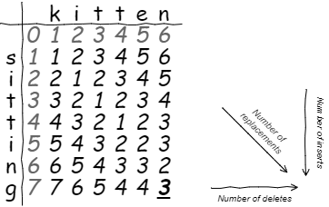レーベンシュタイン距離は挿入、削除、置換の 3 つの操作を行うことができる。例として \(a={\rm kitten}\), \(b={\rm sitting}\) の 2 つの文字列について考えると、\(a\) は以下の 3 つの操作で \(b\) に変換できることから、レーベンシュタイン距離は 3 であることが分かる。