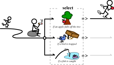 Fig 2 は 🍎りんごが落ちる、🐔鳥が罠にかかる、🐟魚が釣れる、という 3 つのイベントを待機して、最初に起きた 🍎 イベントに関連する処理を (イベントの結果として得たりんごを伴って) 実行する様子を表している。