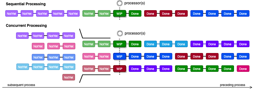 \(A\) と \(B\) をそれぞれ独立した処理としたとき、逐次処理では処理 \(A\) が終了したあとでしか別の処理 \(B\) を開始できないが、並行処理では処理 \(A\) の終了を待つことなく処理 \(B\) を開始することができる。Fig 1 の例では、逐次処理はある時点で実行状態にあるタスク (厳密には定義しないがステップや命令のような処理単位) がたかだか 1 つしか存在しないのに対して、並行処理では同時に複数のタスクが実行状態になることができる。