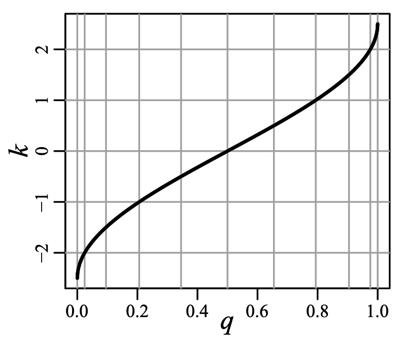 このようにクラスタのサイズを制限するために、圧縮パラメータ \(\delta\) を持つ分位数 \(q\) から概念上のインデックス \(k\) までの非減少関数 (non-decreasing function) としてスケール関数を定義する。\(t\)-digest でよく使用されるスケール関数の 1 つとして \[ \begin{equation} k_1(q) = \frac{\delta}{2\pi} \sin^{-1}(2q-1) \label{eq3} \end{equation} \] が挙げられる。他のスケール関数と同様に \(k_1\) は非減少で、最小値は \(k(0)=-\delta/4\)、最大値は \(k(1)=\delta/4\) である。Fig. 1 は \(\delta=10\) に対する \(k\) と \(q\) の関係を示している。この図では横軸は \(k\) の整数値で等間隔に区切られている。縦軸はスケール関数と等間隔に区切られた横軸の交点から引かれている。\(q=0\) と \(q=1\) 付近では縦軸がどれほど接近しているかに注目して欲しい。