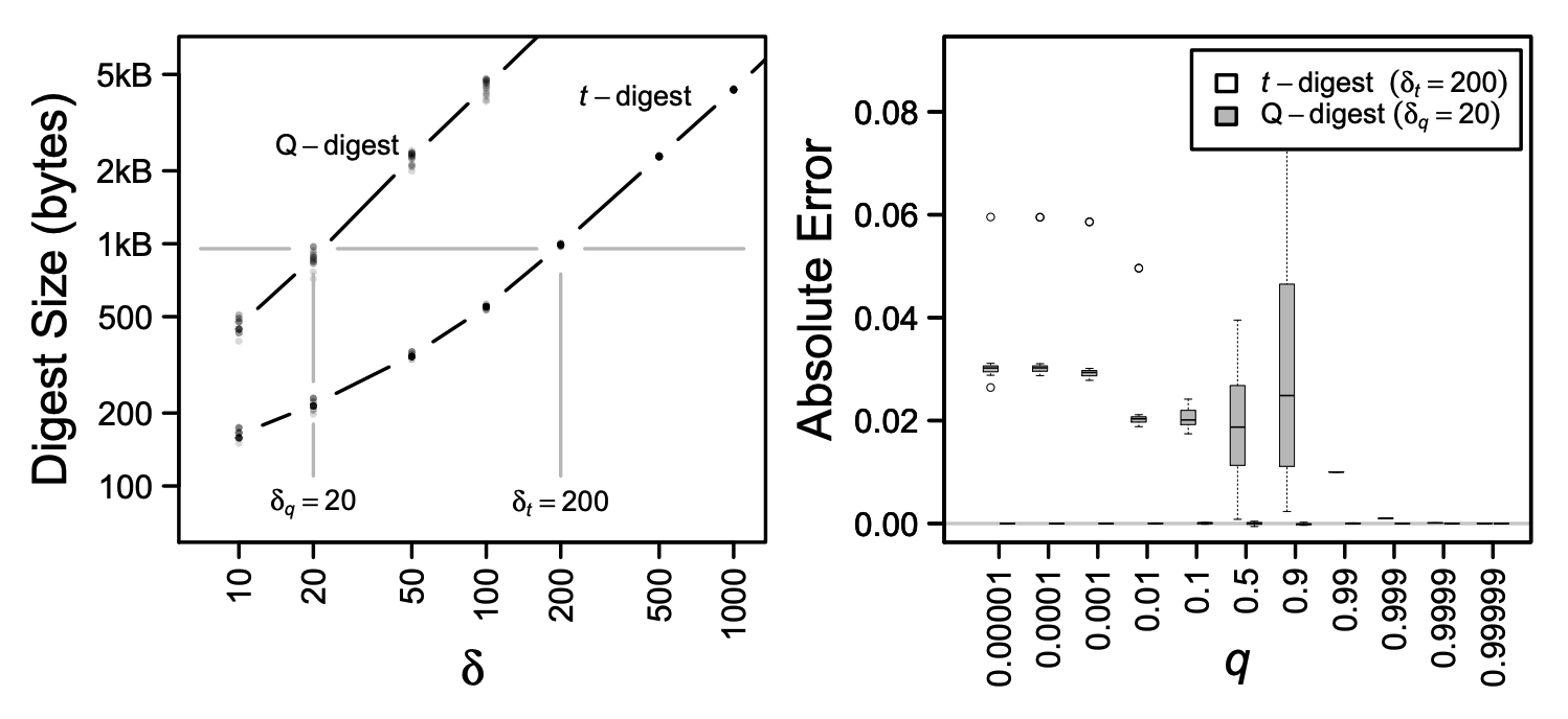 誤差サイズに関しては、同じサイズのダイジェストを比較した場合、\(t\)-digest の 4.0 プレビュー実装は人気のある stream-lib パッケージ (Lib, 2019) の Q-digest (Shrivastava et al., 2004) の実装より優れてる。これは Fig. 10 に示されている。左側のパネルでは、圧縮パラメータ \(q\) とサイズの関係が、両種類のダイジェストに 10 万個の均一に分散されたサンプルが挿入される 20 回の試行に対しそれぞれのダイジェストについて示されている。ダイジェストのサイズを強制的に等しくするために Q-digest では \(\delta_q=20\)、\(t\)-digest では \(\delta_t=200\) の圧縮パラメータが選択された。これにより、左のパネルに示すように Q-digest では約 874 バイト、\(t\)-digest では約 990 バイトの平均ダイジェストサイズが得られる。右のパネルはこれらの条件下での誤差を比較したもので、\(t\)-digest の誤差が \(q\) のすべての値において 1 桁以上小さいことを示している (実際には 2 桁以上)。\(t\)-digest は \(q=0\) に近い値では Q-digest よりも絶対誤差が 3〜5 桁小さい。歪度 (skew) が高い分布で比較した場合は \(t\)-digest に有利であることがさらに顕著となる。この比較で選択されたパラメータはサンプル数に依存することに注意。これは Q-digest のサイズはサンプル数にほぼ対数的に増加するが、\(t\)-digest のサイズは厳密に制限されており、サンプル数が \(2\delta\) を超えるとほぼ一定となるためである。