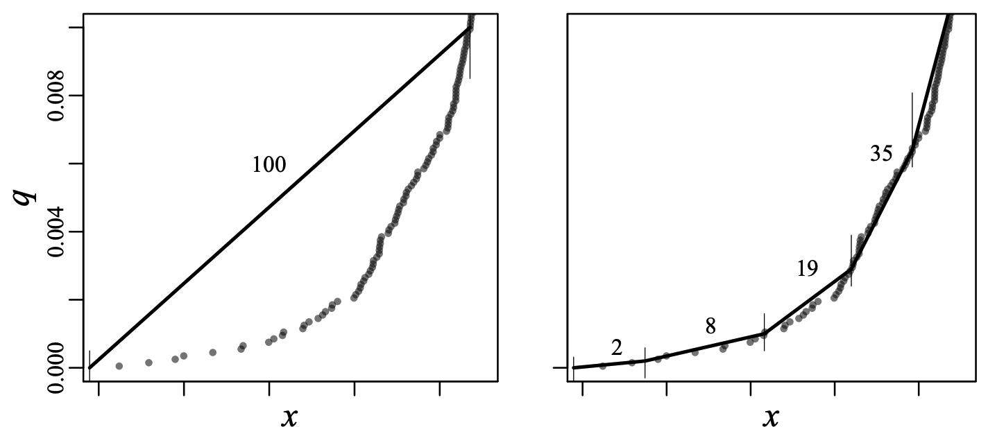 Fig. 2 は、\(q\) の極値付近でクラスタを小さく保つスケール関数を用いて構築された、強く順序付けされ完全にマージされた \(t\)-digest において、\(q\) のテール付近の推定がどのように改善されるかを示している。この図は \(u \sim {\rm Uniform}(0,1)\) となるような \(x \sim \log u\) を使用してサンプリングされた 10,000 個のデータポイントの最初のパーセンタイルを大まかに示している。左のパネルではデータポイントが 100 のクラスタに分けられてそれぞれ 100 のデータポイントを含んでおり、左側のビンのみが表示されている。等サイズのビンを使用しているため、図の左のパネルにおける \(q\) の補間値にはかなりの避けられない誤差が生じている。一方、右側のパネルでは、ほぼ同じ数のビン (100 ではなく 102) で \(t\)-degit を示しているが \(q=0\) 付近のビンのポイント数はかなり少ない。