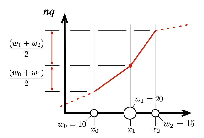 ダイジェスト内の各クラスタ \(\mathcal{C}\) には \(|\mathcal{C}| \gt 0\) のサンプルがあり、関連する平均 \(\bar{\mathcal{C}} = \sum_{x \in \mathcal{C}} x/|\mathcal{C}|\) が存在する。ダイジェスト内のクラスタは、その平均に従って部分順序付けできる。同一の平均を持つクラスタには、クラスタを一貫してインデックス付けできるように任意の固定順序が割り当てられる。この完全順序付けを前提として、各クラスタ \(\mathcal{C}_i\) の左側と右側のクラスタの重みの合計として、クラスタ \(\mathcal{C}_i\) の左と右のクラスタの重みを定義する。つまり \[ \begin{eqnarray*} \mathcal{W}_{\rm left}(\mathcal{C}_i) & = & \sum_{j \lt i} |\mathcal{C}_j| \\ \mathcal{W}_{\rm right}(\mathcal{C}_i) & = & \sum_{j \gt i} |\mathcal{C}_j| \end{eqnarray*} \]