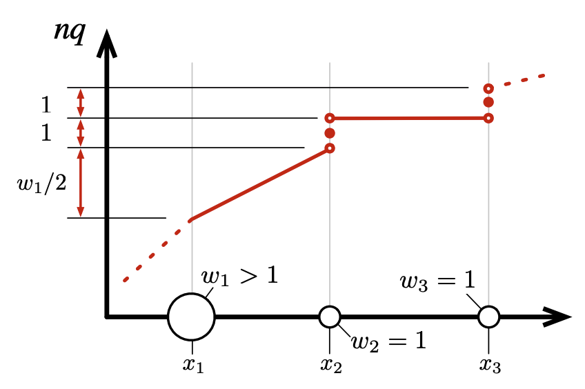 すべてのサンプル \(X = x_1 \ldots x_n\) が昇順で提示され、同値は任意に分割されるとする。サンプルは順序付けられているため、各サンプルのインデックスを使用して新しい値の経験的分位点の値を決定できる。