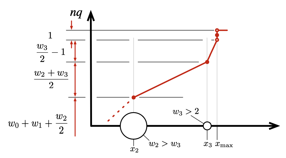 最後に考慮すべきケースはダイジェスト内の最初または最後のクラスタである。このような末端のクラスタが 1 つのサンプルしか持たない場合 \(x_{\rm max}\) はまさにその 1 つのサンプルによるものであることがわかる。クラスタが 2 つのサンプルを持つ場合、それらの 2 つのサンプルは \(x_{\rm max}\) と \(x_n-(x_{\rm max}-x)\) に位置していることが分かっているので、2 つのシングルトンとして扱うことができる。ただしサンプルが 2 つ以上ある場合は、サンプルの半分が重心の前、もう半分が重心の後ろにあるものとしてクラスタを扱うのが有利である。後ろ半分のサンプルについては、1 つは \(x_{\rm max}\) にあるはずなのでそれをシングルトンとして扱い、残りを補間することができる。もちろん最初のクラスタを扱うときはこの議論は逆となり、最初と最後、左と右が逆になる。これはダイジェストの最後のクラスタについて Fig. 5 に示されている。