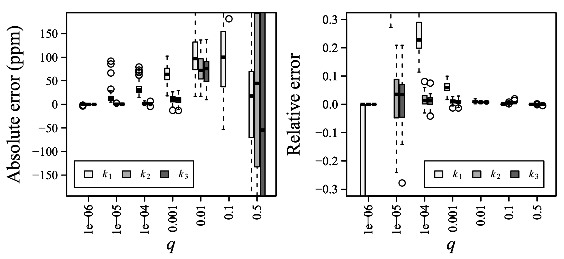 \(q\) が極端になるほど 3 つのスケール関数すべてで絶対誤差が減少するにもかかわらず、相対誤差はそれほど制御されていない。これは Fig. 6 の→パネルに示されている。スケール関数 \(k_2\) と \(k_3\) は \(q=0.001\) まで相対誤差を良好に制御しているが、\(q=10^{-5}\) と \(q=10^{-4}\) では相対誤差が少し増加する。寄り小さな \(q\) の値では、関連するすべての重心には 1 つのサンプルしかないため誤差はゼロとなる。\(k_1\) に対しては状況はそれほど好ましくはなく、相対誤差は \(q=0.0001\) から劇的に増加し、\(q=10^{-5}\) でスケールから外れる。