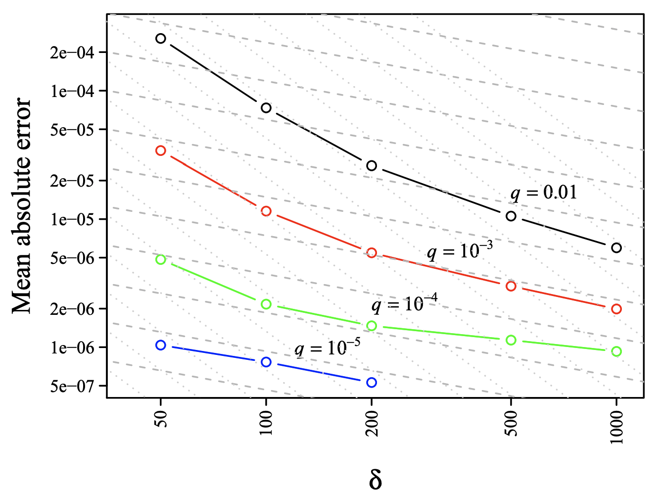 \(t\)-digest では \(q\) 分位数の推定精度は \(q(1-q)\) に対してほぼ一定である。これは \(q\) に依存しない誤差があった以前のアルゴリズムとは対照的である。\(t\)-digest の相対誤差の制限は、一般的に要求される 0 または 1 に近い \(q\) 分位数を計算する際に便利である。Q-digest アルゴリズムと同様に、\(t\)-digest の精度とサイズのトレードオフは、必要なメモリ量が \(\Theta(\delta)\) にのみ比例する単一の圧縮パラメータ \(\delta\) を設定することによって制御できる。