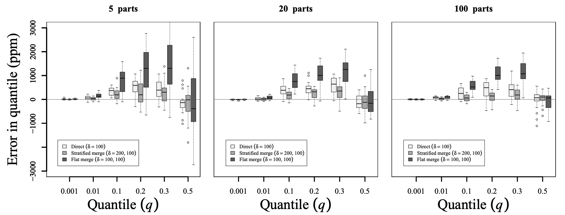 Fig. 9 はこれがどのようになるかを示している。この図は 20 回の試行で 1,000,000 サンプルを要約したときに達成された精度を示している。左から右のパネルは 5, 20, 100 のサブダイジェストをマージした結果が示されている。各パネル内の 3 本のバーは、内部的に \(\delta=300\) を使用する単一のダイジェスト、100 の階層化マージ、サブダイジェストで \(\delta=200\)、結果に \(\delta=100\) を使用するマージダイジェスト、および \(\delta=100\) の非階層化マージの使用を表している。すべての並列度で非階層化マージの結果は、非マージ階層化の結果より悪かった。階層化並列のマージは、5-way 並列処理で少し変動はあるものの、非並列マージと同等であったが、並列度が高くなるにつれて徐々に精度が向上した。