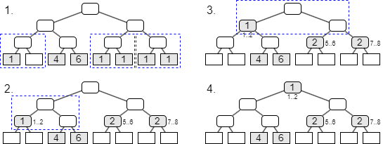 Fig 1 は \(q\)-digest による頻度分布の圧縮過程を示している。初期状態の配列構造では少なくとも 7 つの頻度値を保存する必要があるが、q-digest で圧縮した後では 5 個の頻度値を保存すれば良い。