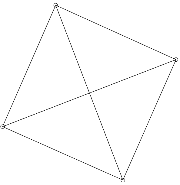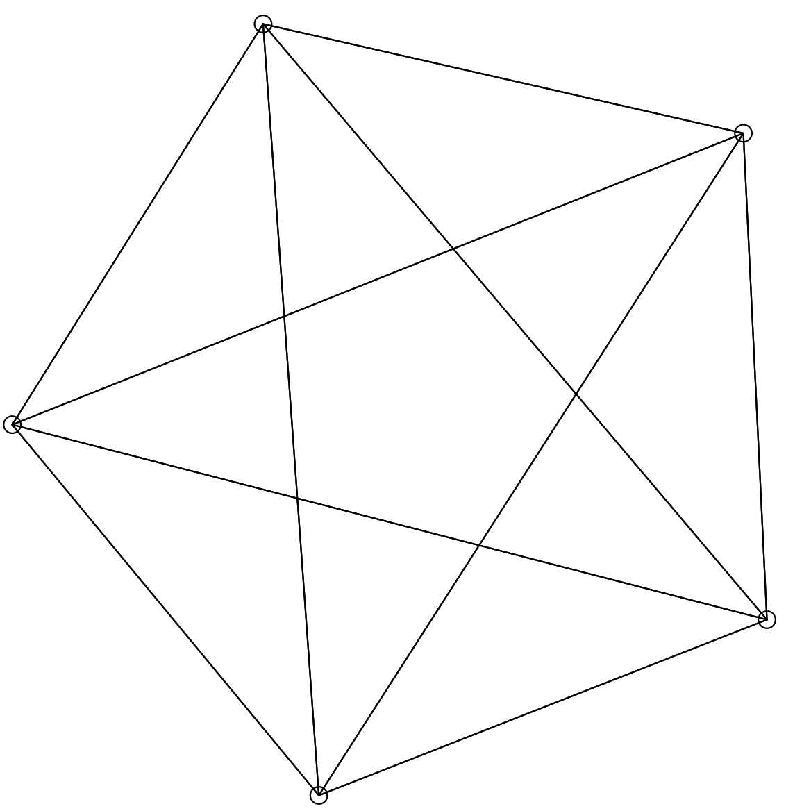我々のアルゴリズムから得られる最も自然で好ましい結果は、根底にある力学法則のパラダイムが最も明らかとあんる、対称性の高いグラフから得られるものだろう。グラフレイアウトに関する論文でよく使われるグラフの 1 つが \(K_5\) (Figure 10) である。我々の形式では、元の論文の図番号と引用を示すことによって図のキャプション内のすべてのグラフを識別する。これらは引用された論文に掲載されているとおりにそれらの図を複製したものである。前者のキャプションは引用した論文で議論されているアルゴリズムによって生成された表現を識別するものであり、後者は単に著者によって提案されただけのものでそのアルゴリズムによって生成されたものではない。