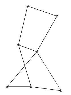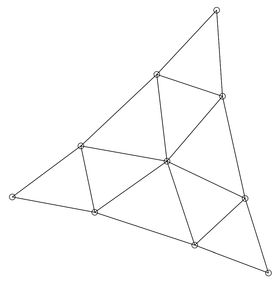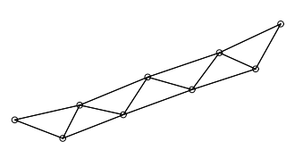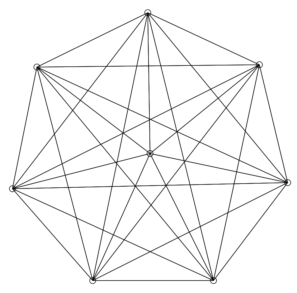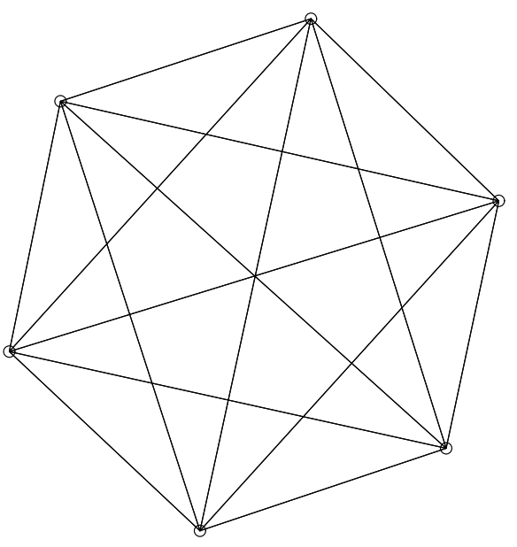 \(K_5\) と他の完全ブラフ \(K_4\) (Figure 11)、\(K_6\) (Figure 12 と Figure 13)、\(K_8\) (Figure 14) は平衡状態における引力と反発力のバランスを示している。\(K_4\) は平面的 (planar; 辺が交差していないグラフ) だがそう表現されていないことに注意。平面表現には歪曲した辺が必要だが、おそらくここで生成される表現ほど人間にとって自然でない。完全グラフは次数が高くなるほど小さくなり、辺の密度が高くなるほど平衡に達する距離が短くなる。頂点間の理想的な距離の計算は、\(K_2\) Figure 15 の単純なケースでのみ理想的に説明したとおりに機能するが、すべての図は拡大フィルターを通しているためすべてほぼ同じサイズとなっている。単純な平面、またはほぼ平面の対称グラフの例では、Figure 16 の 3 つと、最初に Kamada と Kawai [7] で登場した Figure 17、Davidson と Harel [9] で登場した Figure 18 の 1 つが挙げられる。Kamada と Kawai が提示したグラフは特に簡単で、我々のレンダリングは本質的に彼らのものと同じである。