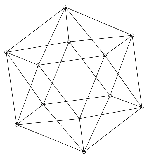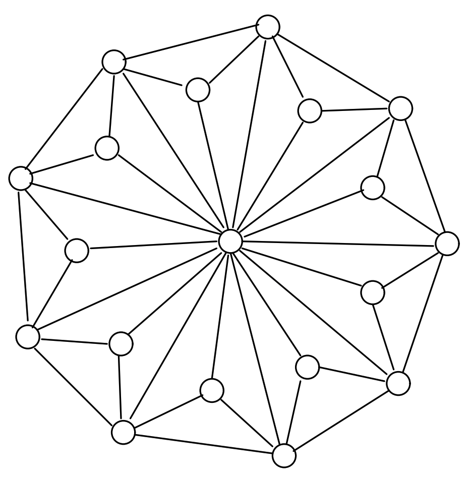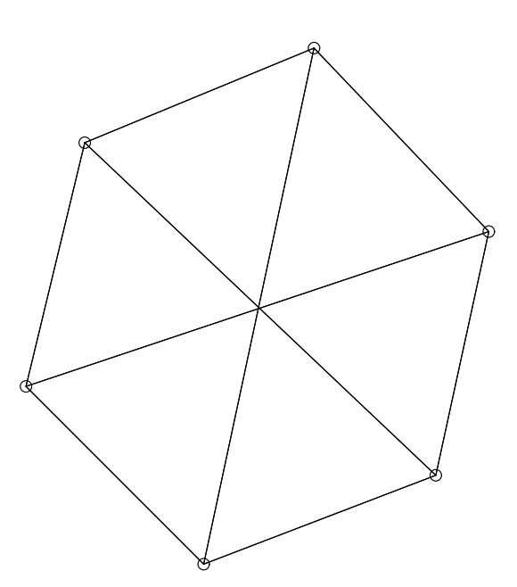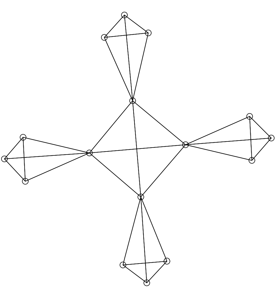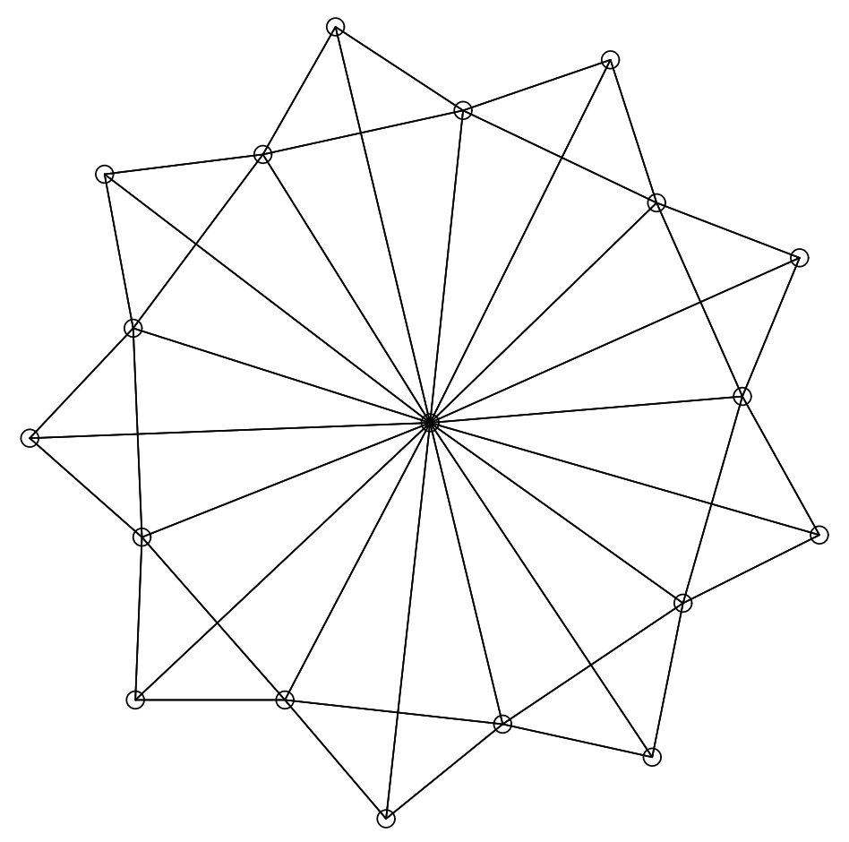 我々のアルゴリズムが対称グラフで遭遇する他の問題は、Davidson と Harel [9] の最初の図である Figure 24 に示されている。オリジナルの図 Figure 25 は問題をもう少し明確にしている。このグラフは平面であり、Davidson と Harel は平面的表現を生成したが、内側の頂点からの反発力によってより魅力的で安定した構成を達成することができない。