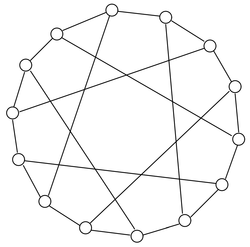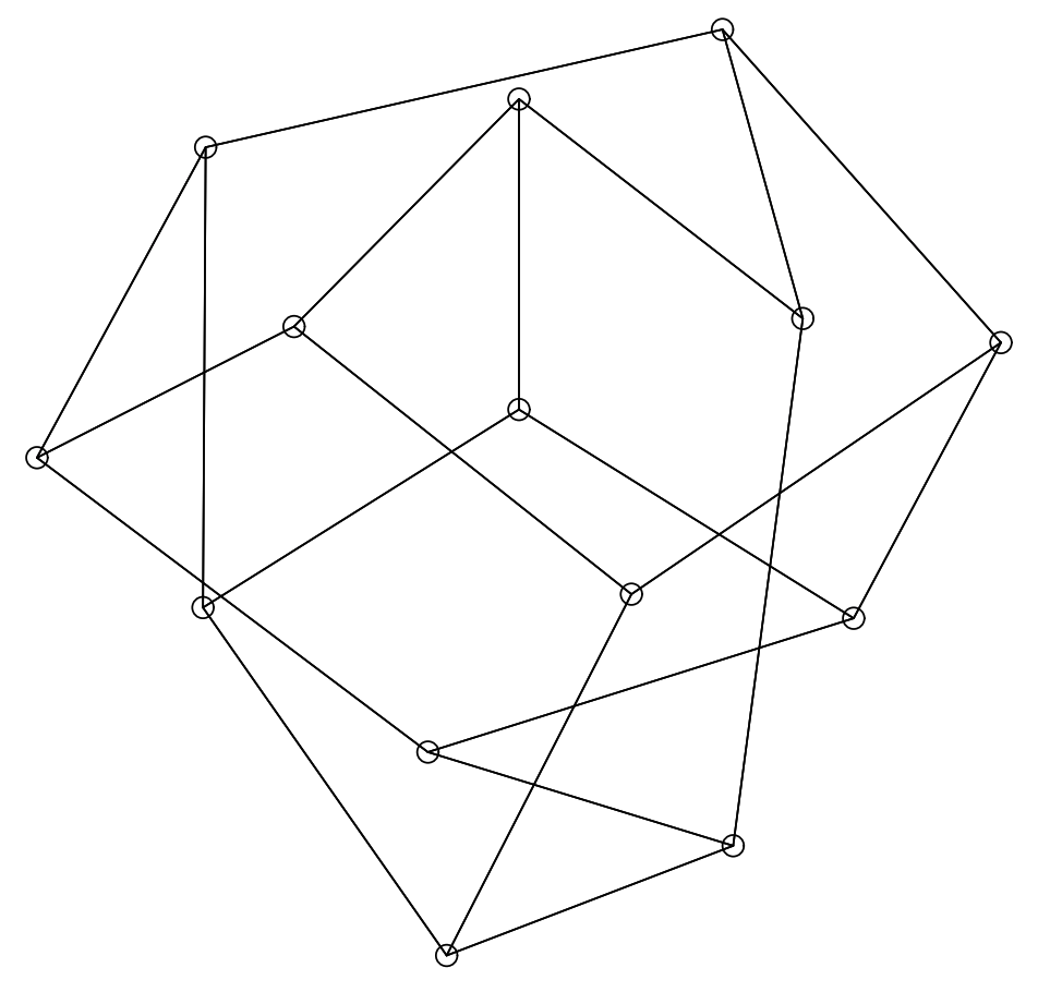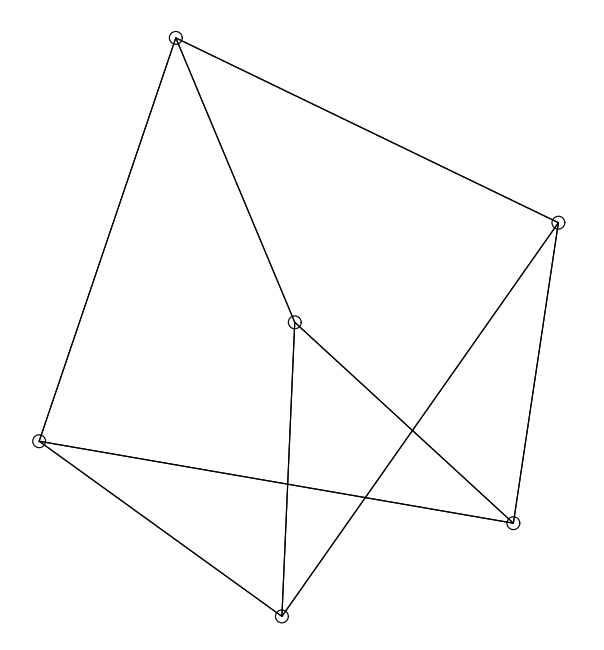もう一つの対称性の高いグラフは \(K_{3,3}\) である (Figure 19 と Figure 20)。最初の表現は許容できるものではあるが、対称性の次元が一つ欠けているためおそらく他のものほどよくはない。Heywood グラフ (Figure 21) は Davidson と Harel から引用されたものだが、彼らのアルゴリズムではこれは達成されていない。彼らのレイアウトは Figure 22 である。それでもおそらく我々の Figure 12 よりは望ましい。両方の手法が失敗するのはおそらく対称レンダリングが近傍間に長い距離を必要とするからであろう。