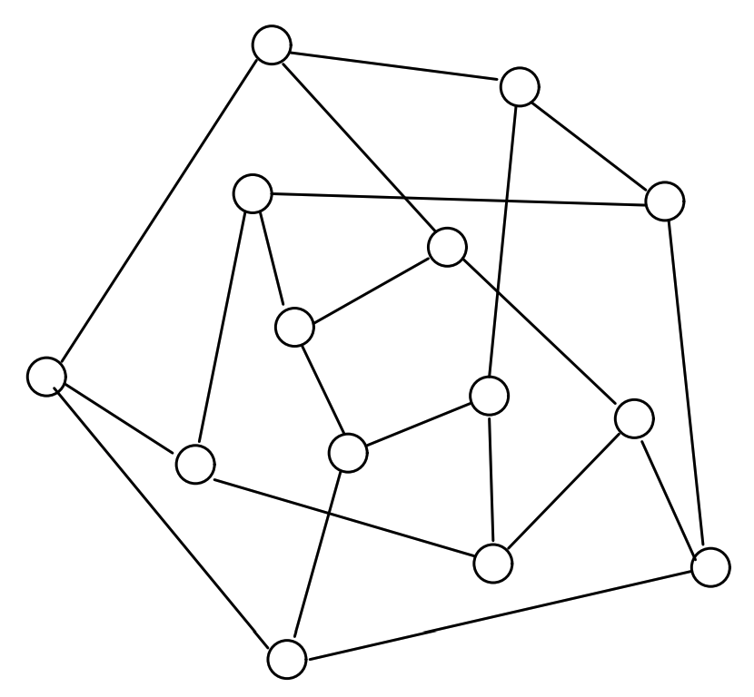 次のような例を考える: 頂点は亜原子粒子や天体のように振る舞い、互いに引力と反発力を及ぼし合う。その力が運動を引き起こす。我々のアルゴリズムは分子や衛星のシミュレーションに似ており \(n\)-体問題と呼ばれることもある。しかし Eades に倣えば忠実なシミュレーションをする必要はなく、非現実的な力を非現実的な方法で適用することができる。そこで Eades のように隣接する調弦だけが互いに引き合うようにし、すべての頂点は互いに反発するようにする。これは上記の 2 つのガイドラインの非対称性と一致する。