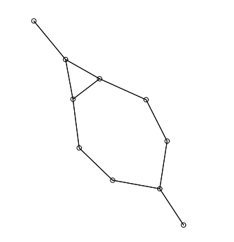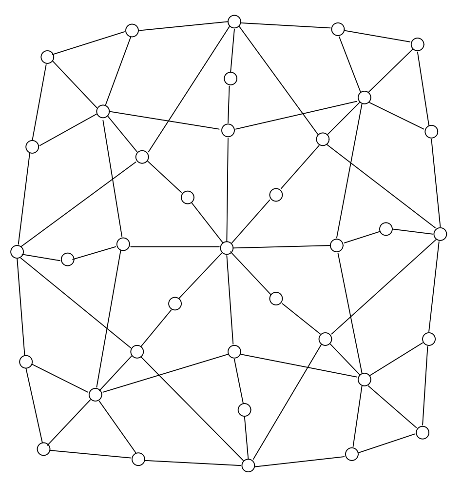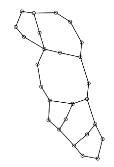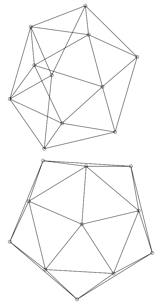 Figure 28 は 1 つの入射辺を欠いた正二十面体の 2 つの異なるレイアウトを表している。最初のレイアウトは正二十面体の伝統的な立体表現に似ている (ただしある頂点を欠いている)。もう一つのレイアウトは平面だが、一部の辺が見にくくなっている。これまで論議してきたすべての方法のうち Davidson と Harel の焼きなまし法だけが、頂点が辺で隠れることを明確に避けようとしている。Figure 29 は正二十面体である。平面ではないが (正二十面体は平面である) レイアウトは非常に魅力的である。
