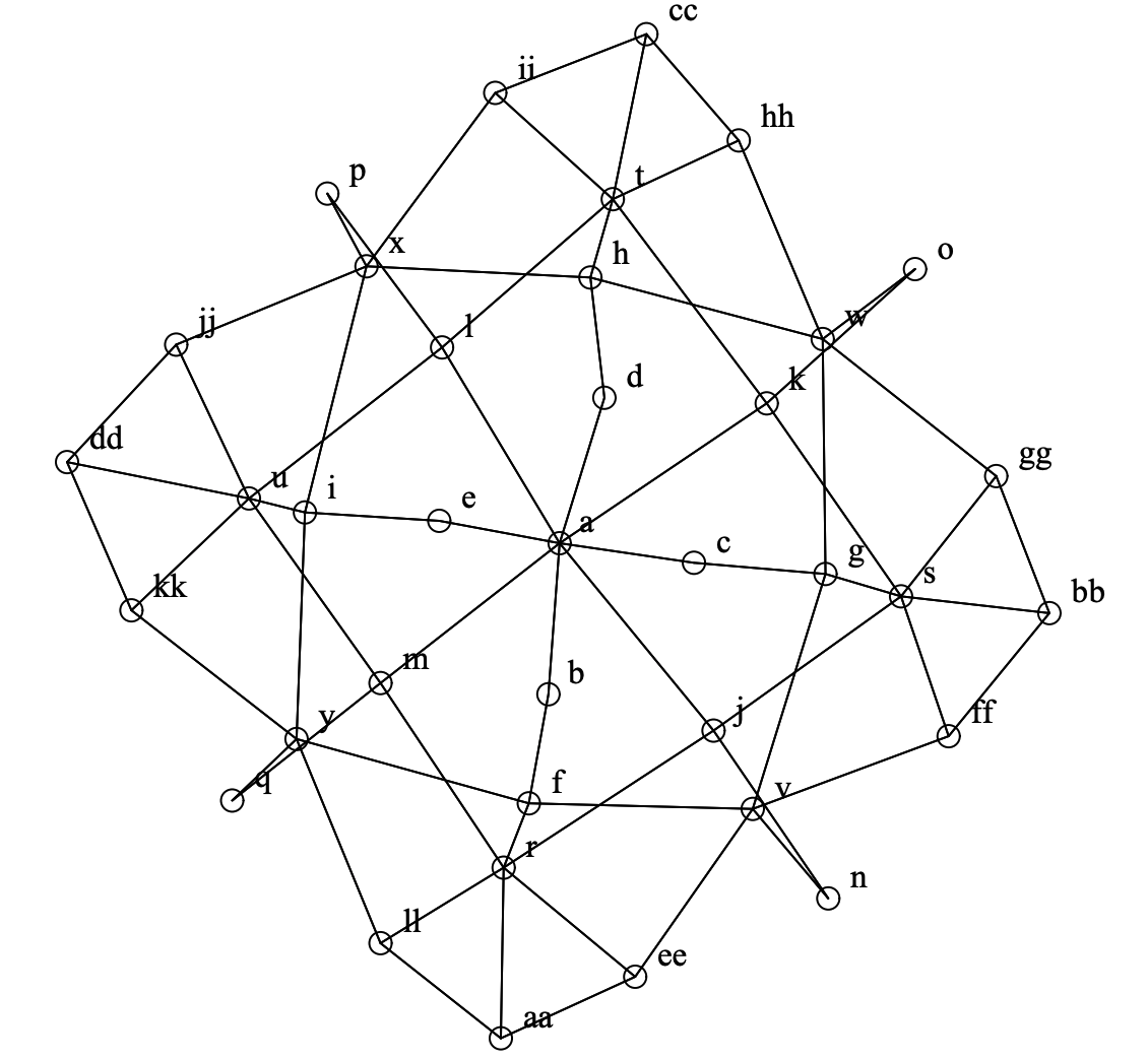 Davidson と Harel の論文の目玉は Figure 26 である。我々の表現である Figure 27 にはある点で欠陥がある。Davidson と Harel はグラフを完全に平面にするために、2 つの隣接する頂点の間に最も外側の頂点 \(p\), \(q\), \(n\), \(o\) を描画した。比較として、Davidson と Harel が提供する時間複雑性の公式を使用すると彼らのこの図を生成するのに 10 分かかるが、我々のアルゴリズムは同等のマシンで 30 秒である。