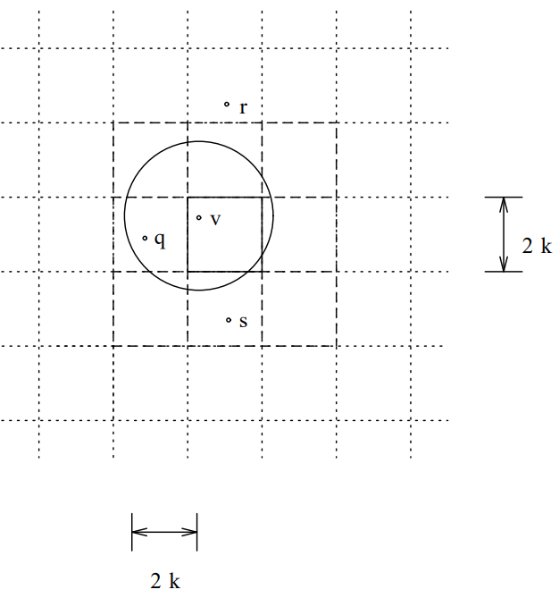 本論文では、前のセクションで説明した基本的なアルゴリズムと、以後 grid-variant と呼ぶアルゴリズムを適用した結果について述べる。これは互いに近接する頂点間の反発力のみを計算するために画面を正方形のグリッドに分割するようにアルゴリズムを書き直し、各反復において各頂点をそのグリッドの正方形に配置し、その頂点とグリッドの近接する正方形の頂点との間の反発力のみを計算する。引力は通常通り計算する。これはすべての頂点に反発力を適用するのとほぼ等価だが、次の方法で計算する: \[ f_r = \frac{k^2}{d} u (2k - d) \] ここで \[ u(x) = \left\{ \begin{array}{cl} 1 & \mbox{if $x \gt 0$} \\ 0 & \mbox{otherwise} \end{array} \right. \] 実際にはグリッドボックスの形状が正方形であるために歪みが生じ、すべての方向で落下距離 (fall-off distance) を同じにする必要があることに気づいた (反発力は該当地点の中心から半径 \(2k\) の円形領域内のすべての頂点から加えられる)。Figure 7 では、頂点 \(v\) は頂点 \(q\) から反発されるが、グリッドのすぐ隣の正方形の外にある \(r\) や、考慮されたが遠すぎて却下された \(s\) からは反発力を受けない。