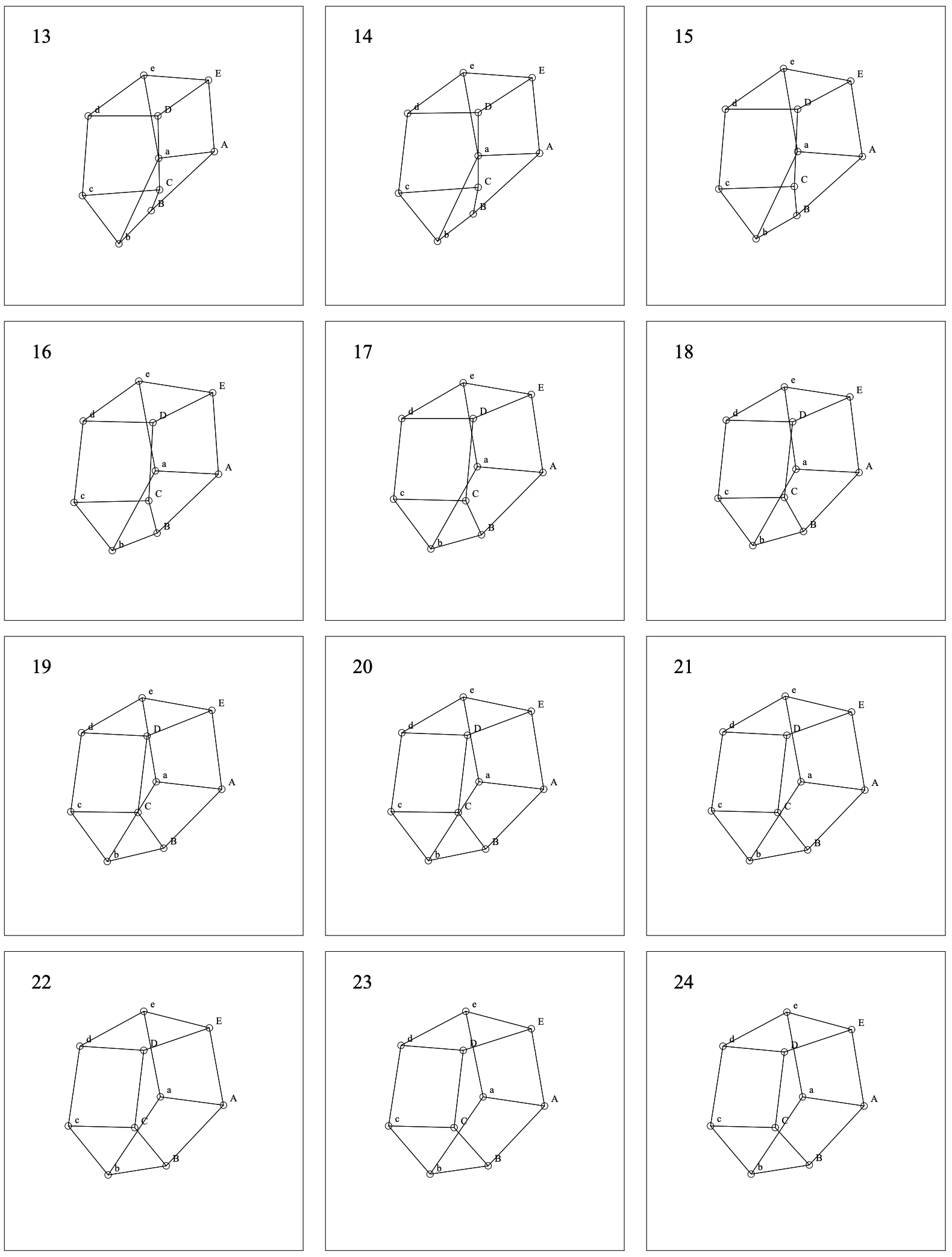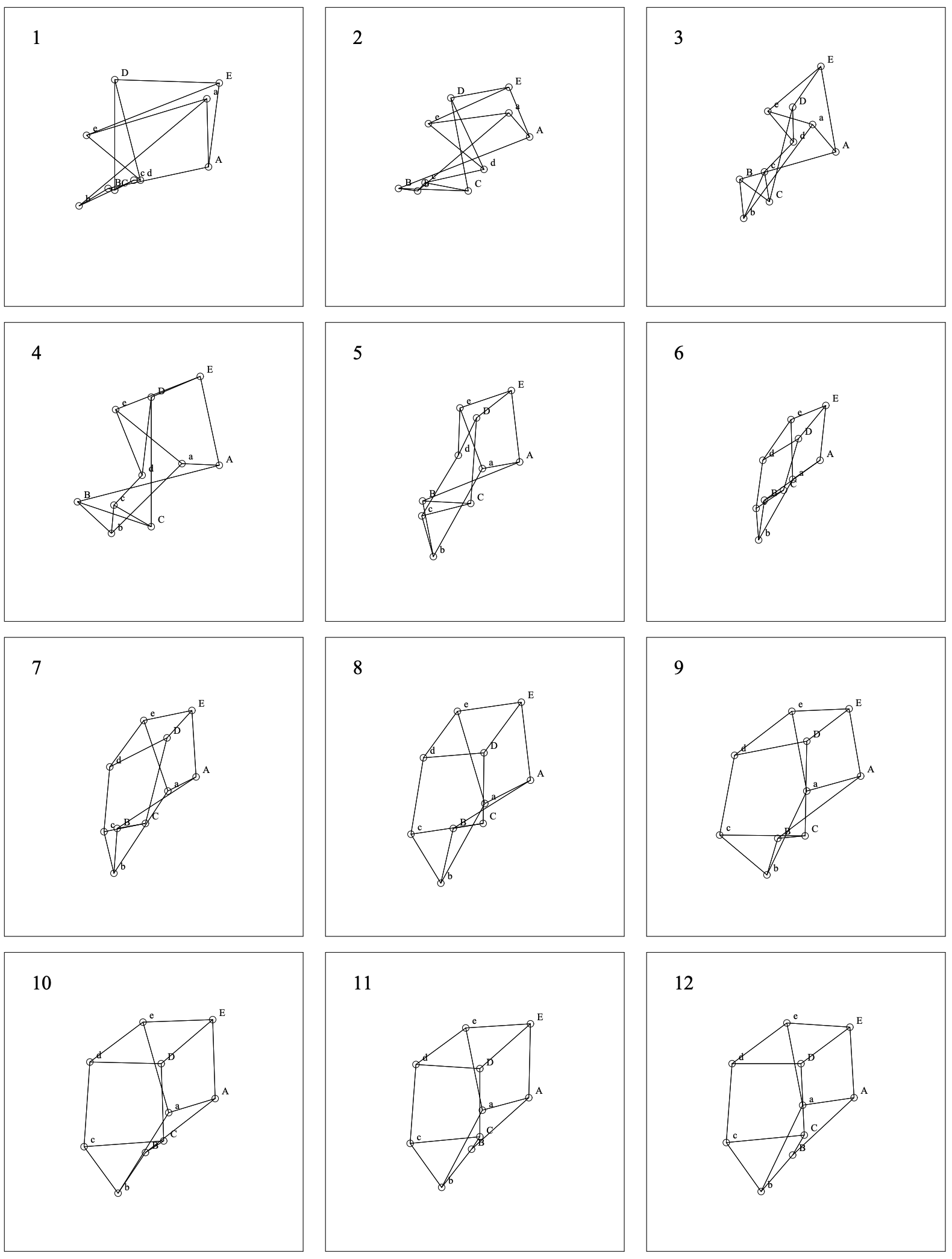 実際のアルゴリズムを示すために Figure 8 と Figure 9 に五角柱をレイアウトするステップを示す。最初のフレームにはランダムな初期位置にあるすべての頂点が表示されている。最初の 12 フレームは焼き入れを、後の 12 フレームは煮沸を示している。この論文の図に枠がある場合、それは境界が我々のアルゴリズムの一部であることを表している。他のほとんどの図には枠がないが、これはフィルターによって拡大縮小されていることを意味する。