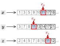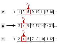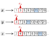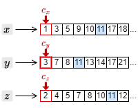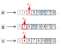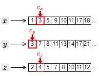 3. カーソルを進めたことで、もっとも大きい文書 ID は \(c_y\) の指す 7 となった。このため、それ以外の \(c_x\) と \(c_z\) のカーソルを 7 以上の文書 ID を検出するまで進める。