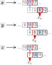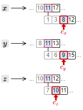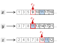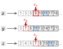 4. カーソルを進めたことで、もっとも大きい文書 ID は \(c_x\) の指す 9 となった。このため、それ以外の \(c_y\) と \(c_z\) のカーソルを 9 以上の文書 ID を検出するまで進める。