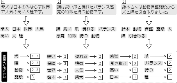 例として 3 つの文書をテキスト解析して作成した転置インデックスを Fig 1 に示す。それぞれの文書はテキスト解析を受けてタームに分割され、それぞれのタームに対して出現位置として文書 ID が関連付けられ転置インデックスに記録されている。