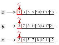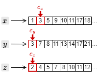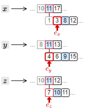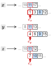 例としてクエリー \(x\) AND \(y\) AND \(z\) に対する検索方法を考える。まず、転置インデックスの中から \(x\), \(y\), \(z\) のポスティングリストを取得し、それぞれの先頭にカーソルを置いたところから開始する。