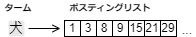 全文検索の基本的なアルゴリズムは転置インデックス (inverted index) と呼ばれるデータ構造を用いる。このデータ構造は事実上すべての情報検索システムが中核に採用している [1]。転置インデックスは、文書集合に含まれるターム (正規化されたトークン) とその出現位置を記録したデータ構造である。1 つのタームに対する出現位置のリストをポスティングリスト (posting list) と呼ぶ。ポスティングリストの位置情報は昇順にソートされている。