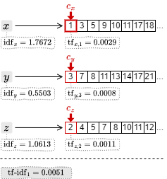 1. カーソルの中で最も小さい文書 ID の 1 を取得して \(c_x\) を一つ進める。ここで \({\rm tf\mbox{-}idf}_1 = 1.7672\times 0.0029\) を算出してスコアを得る。