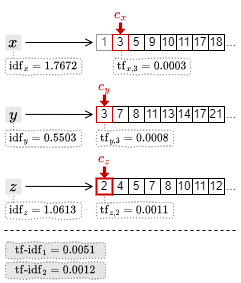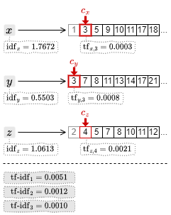 3. カーソルの中で最も小さい文書 ID の 3 を取得して \(c_x\) と \(c_y\) を一つ進める。ここで \({\rm tf\mbox{-}idf}_3 = 1.7672\times 0.0003+0.5503\times 0.0003\) を算出してスコアを得る。