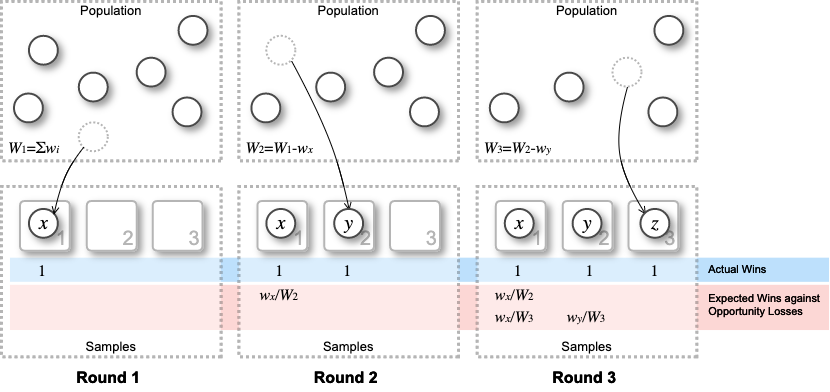 この例により早期に選択された要素は抽選が進むにつれて機会損失が加算されてゆくことが分かるだろう。ここで紹介する方法は、選択済みの要素が被った機会損失分を期待値に換算し加算することによって公平化するという考え方に基づいている。