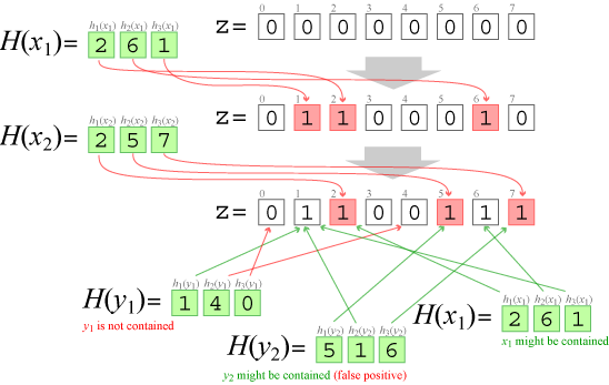 集合に値 \(x\) が含まれているかを検査するとき、\(z\) の \(h_i(x)\) ビット目がすべて 1 であるかを検証する。すべて 1 であれば集合の中に要素 \(x\) が含まれている可能性がある。すべてでなければ集合に \(x\) は含まれていない。