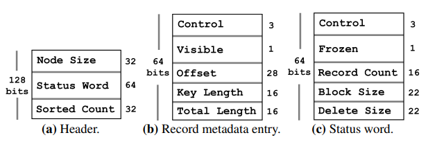 ステータスワード. Figure 2 に示すステータスワードは更新中に変更するノードメタデータを保存する 64-bit 値である。葉ノードではこのワードに次のフィールドが含まれている: (1) PMwCAS control bits (3-bit) はワードをアトミックに更新するために使用される、(2) frozen フラグ (1-bit) はノードが不変であることを告知する、(3) record count フィールド (16-bit) はレコードメタデータ配列のエントリ総数を格納する、(4) block size フィールド (22-bit) はノード末端のレコードストレージブロックが占めるバイト数を保存する、(5) delete size フィールド (22-bit) は、ノードをマージや再編成するタイミングを決めるのに有用なノード内の論理削除領域の量を格納する。内部ノードのステータスワードには 2 つのフィールドしか含まれていない。これは内部ノード上ではシングルトン更新を実行しないためほかのフィールドが不要なためである。検索パフォーマンスの理由から我々は (例えばレコードの追加や更新時に) 内部ノードを大規模 (wholesale) に置き換えることを選択している。