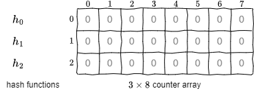 Count-Min スケッチのカウンターは \(w \times d\) の 2 次元整数配列で表される。初期状態のカウンターはすべて 0 が設定されるものとする。\(d\) と \(w\) は誤差パラメータ \((\epsilon,\delta)\) に基づいて式 (\(\ref{dw}\)) のように定めることができる。\[ \begin{equation} \left\{ \begin{array}{rcl} d & = & \lceil \log_e \frac{1}{\delta} \rceil \\ w & = & \lceil \frac{e}{\epsilon} \rceil \end{array} \right. \label{dw} \end{equation} \] また \(\{0,\ldots,w-1\}\) のハッシュ値を生成する \(d\) 個のハッシュ関数 \(h_0\), ..., \(h_{d-1}\) を pair-wise 独立族からランダムに選択する。