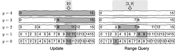 Fig 4 の例は最大 \([0,15]\) 範囲の要素 (\(n=16\)) を持つ Count-Min スケッチの 5 層構造である。それぞれの層は \(y\) に対応する二進レンジを要素としてその頻度を保存する。要素 10 の頻度を更新する場合、上層の Count-Min スケッチから \([0,15]\), \([8,15]\), \([8,11]\), \([10,11]\), \([10,10]\) の頻度を更新する (図左)。\([3,9]\) のレンジクエリーでは \([3,3]\), \([4,7]\), \([8,9]\) の頻度を参照して合計すれば良い (図右)。