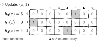 Fig 3 の例では一連の更新の後に \(x\) を照会し、該当するカウンター内の最小値である 1 が推定合計値として返される。