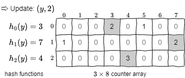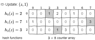 Fig 2 の例では Count-Min スケッチを \((x,1)\), \((y,2)\), \((z,1)\) で更新している。いくつかのカウンターはハッシュの衝突により異なる要素に対して重複して加算されていることに注意。