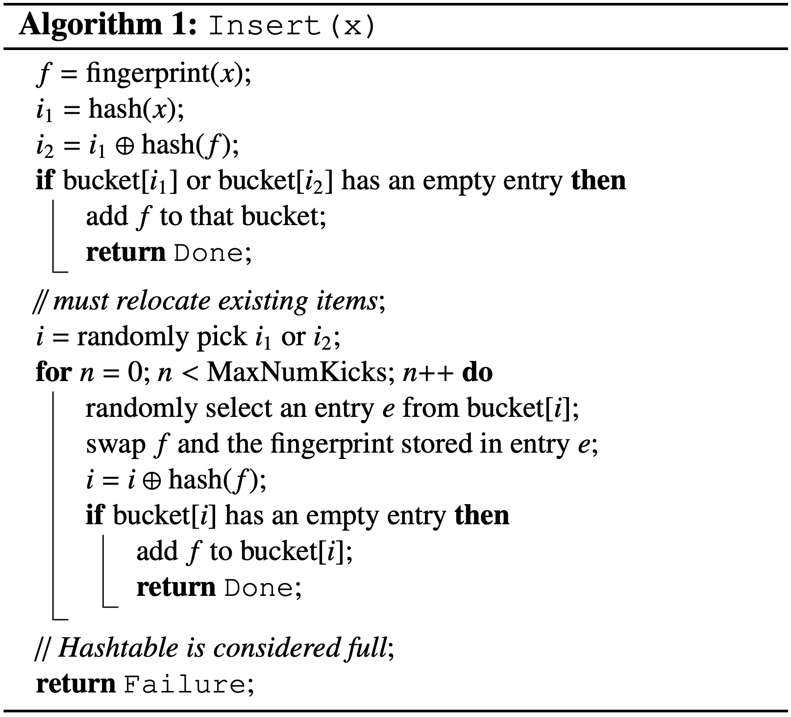 部分キー Cuckoo ハッシングを使い、Cockoo フィルターはアルゴリズム 1 に示すプロセスによって新しい要素を動的に追加する。これらのフィンガープリントは \(h_1\) や \(h_2\) のサイズよりかなり短くすることができるため 2 つの結果が生じる。第一に、式 (\(\ref{hash}\)) で計算される \((h_1,h_2)\) の可能な選択肢の総数は、標準的な Cuckoo ハッシングのような完全なハッシュを使用して \(h_1\) と \(h_2\) を導出するよりもはるかに小さくなる可能性がある。これにより多くの衝突を引き起こす可能性があり、特に ([10, 13] のような) Cuckoo ハッシングに関する以前の分析は成り立たない。部分キー Cuckoo ハッシングの完全な解析はまだ未解決のままである (この論文の範囲を超えている)。セクション 4 ではこの問題についての詳細な議論を行い実用的なワークロードに対して高い占有率を達成する方法について考察する。