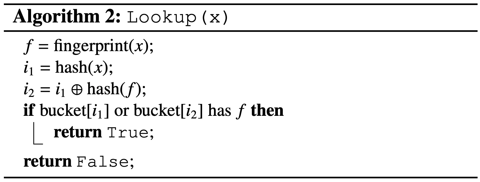 Cuckoo フィルターの検索処理はアルゴリズム 2 に示すように単純である。要素 \(x\) が与えられると、アルゴリズムはまず式 (\(\ref{hash}\)) に従って \(x\) のフィンガープリントと 2 つの候補バケットを算出する。そしてこれら 2 つのバケットが読み取られる。どちらかのバケット内の既存のフィンガープリントが一致すれば Cuckoo フィルターは true を返し、そうでなければ false を返す。バケットのオーバーフローが起きない限り偽陽性は発生しないことに注意。