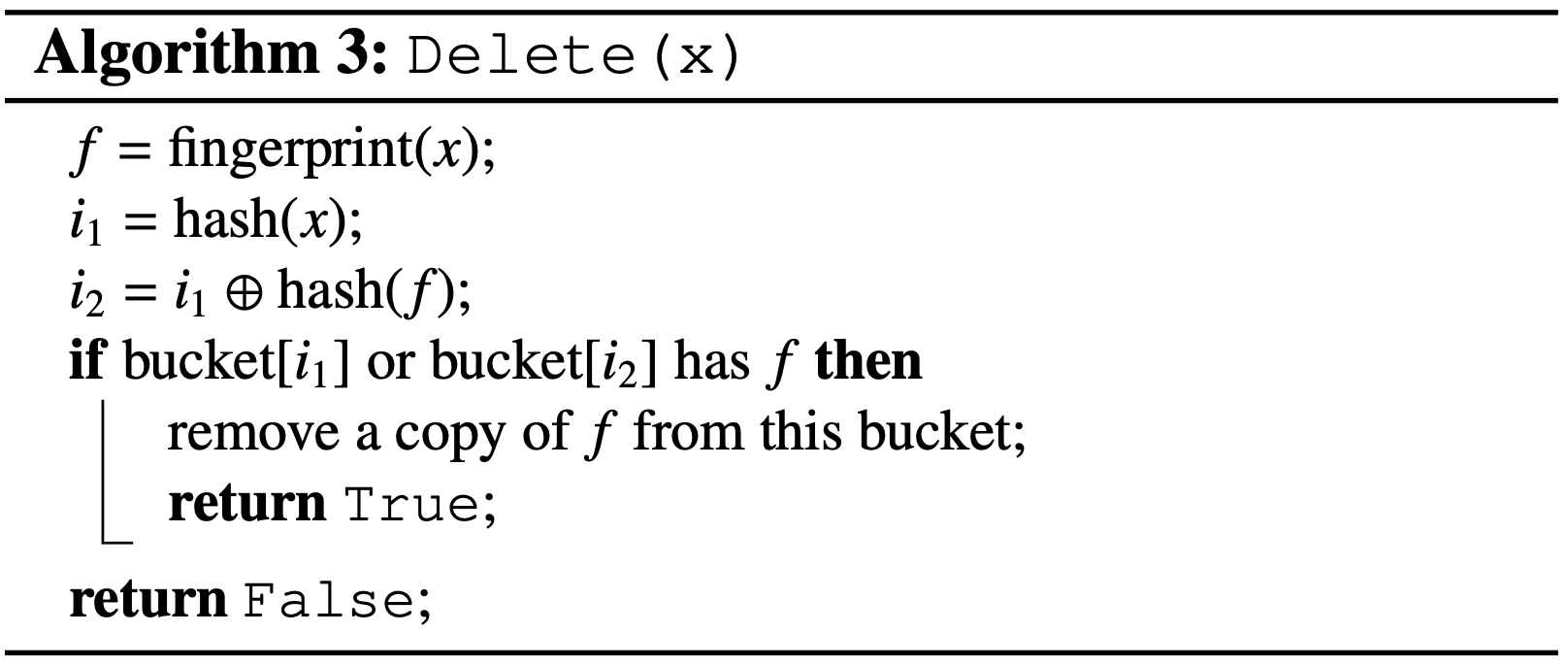 アルゴリズム 3 で示されている Cuckoo フィルターの削除プロセスははるかに簡単である。特定の要素について両方の候補バケットをチェックし、どちらかのバケット内でフィンガープリントが一致すると、その一致したフィンガープリントのコピーがそのバケットから削除される。