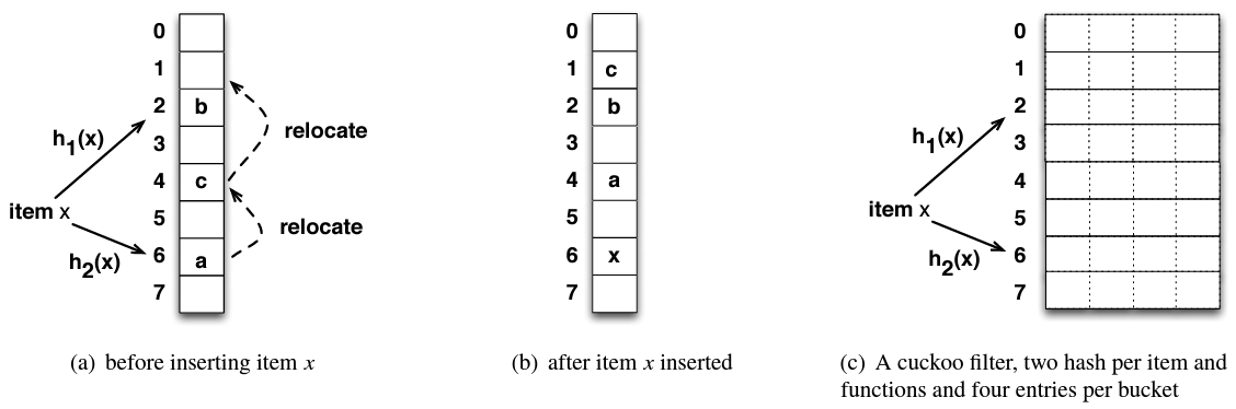 Cuckoo フィルターは Cuckoo ハッシュテーブル [21] のコンパクトな変形で、Key-Value ペアの代わりに、挿入された各要素のフィンガープリント (ハッシュ関数を使用して要素から導出されたビット列) のみを格納する。フィルターはフィンガープリントで密に埋められており (例えば 95% のエントリが占有されている) 高い空間効率が得られる。要素 \(x\) の集合メンバーシップクエリーは単に \(x\) のフィンガープリントについてハッシュテーブルを検索し、同一のフィンガープリントが見つかった場合に true を返す。