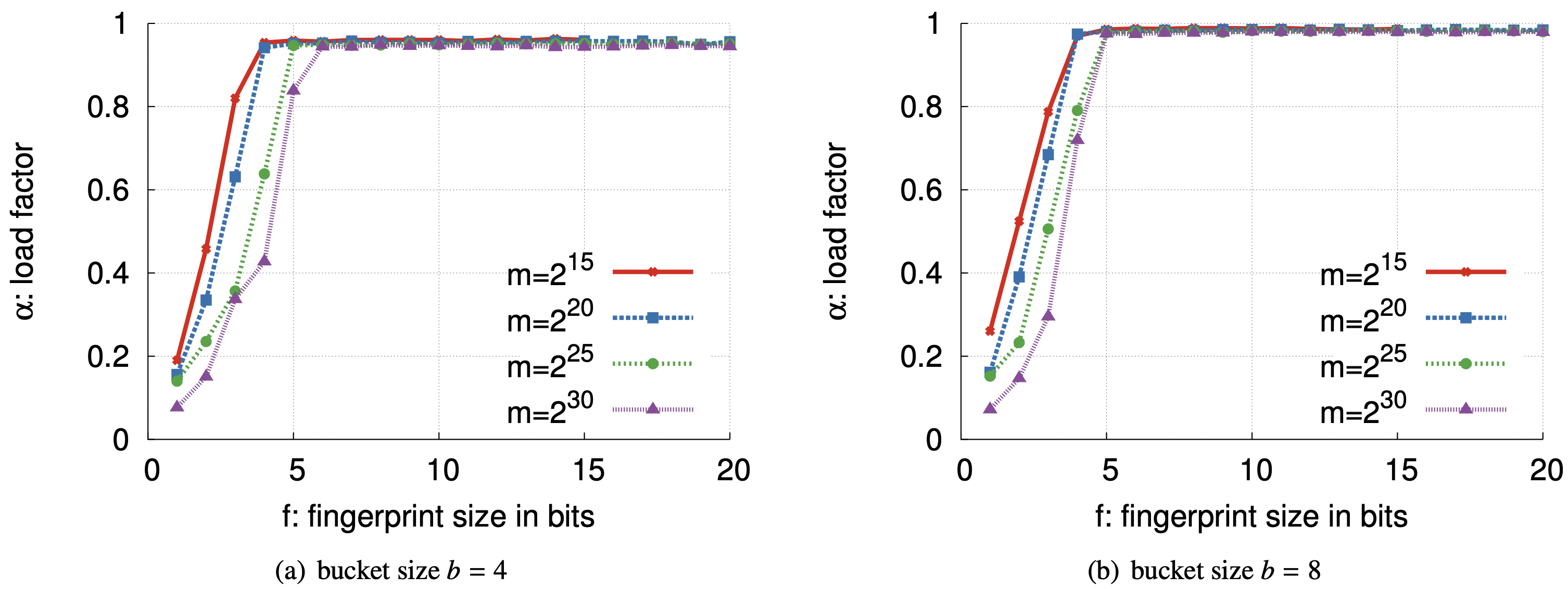 経験的評価: Figure 2 はフィンガープリントサイズ \(f\)、バケットサイズ \(b\)、テーブルのバケット数 \(m\) を変化させたときに部分キー Cuckoo ハッシングで達成される負荷係数を示している。実験ではフィンガープリントのサイズ \(f\) を 1 から 20 ビットまで変化させた。ランダムな 64 ビットのキーが空のフィルターに挿入され、1 回の挿入で空のエントリを見つけるために既存のフィンガープリントが 500 回以上再配置されたところで (我々の "満杯" 条件) 停止し、達成された負荷係数 \(\alpha\) を測定する。我々はこの実験を \(m=2^{15},\) \(2^{20},\) \(2^{25},\) \(2^{30}\) 個のバケットを持つフィルターに対して 10 回実行し、10 回の試行に渡る最小の負荷を計測した。テストベッドマシンのメモリ制約により大きなテーブルは使用しなかった。