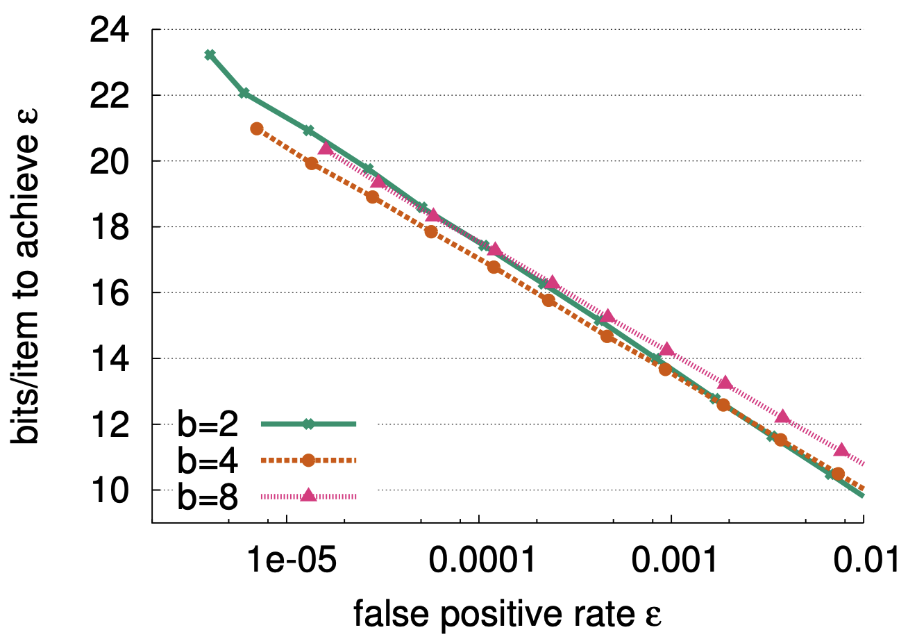 空間コストの上限: 既に示したように \(f\) も \(\alpha\) もバケットサイズ \(b\) に依存する。式 (\(\ref{eq4}\)) による平均空間コスト \(C\) は \(\alpha\) が \(b\) とともに増加する: \[ \begin{equation} C \le \lceil \log_2(1/\epsilon) + \log_2(2b)\rceil / \alpha \label{eq7} \end{equation} \] によって制限される。例えば \(b=4\) で \(1/\alpha \approx 1.05\) のとき、式 (\(\ref{eq7}\)) は各要素に \(1.44 \log_2(1/\epsilon)\) ビット以上を必要とする Bloom フィルターよりも Cuckoo フィルターの方が漸近的に (定数係数で) 優れていることを示している。