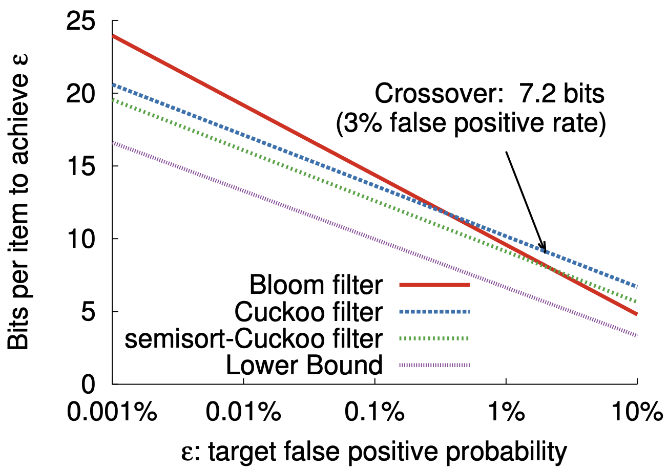 Cuckoo フィルターを構築する場合、そのフィンガープリントのサイズは目標とする偽陽性率 \(\epsilon\) によって決まる。その値が小さいほどより多くの誤ったクエリーを拒否するためにより長いフィンガープリントが必要となる。興味深いことに、実際の多くのワークロードでは Cuckoo フィルターが Bloom フィルターより実際に優れていることを示す一方で、Cuckoo フィルターで使用される最小フィンガープリントのサイズは (セクション 4 で説明するように) テーブルのエントリ数と共に対数的に増加することから、これらは漸近的に悪くなっている。結果としてテーブルが大きいほど要素ごとの空間のオーバーヘッドが大きくなるが、この余分な空間の使用はより低い偽陽性率をもたらす。要素数が数十億以下の実用的な問題では \(\epsilon \lt 3\%\) であれば Cuckoo フィルターは削除をサポートしながら削除不可能で空間最適化された Bloom フィルターよりも少ない空間を使用する。