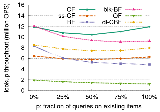 各クエリーでは、すべてのフィルターが最初に CityHash [1] を使用して要素の 64 ビットハッシュを生成する。次に各フィルターはハッシュの 64 ビットを必要に応じて分割する。例えば Bloom フィルターは上位 32 ビットと下位 32 ビットをそれぞれ最初の 2 つの独立したハッシュとして扱い、これら 2 つの 32 ビット値を使って他の \(k-2\) ハッシュを算出する。64 ビットハッシュを計算する時間 (我々のテストベッドでは 1 要素あたり約 20 ナノ秒) は測定に含まれている。すべての実験では 2 つの Intel Xeon プロセッサ (L5640@2.27GHz, 12MB L3 キャッシュ) と 32GB DRAM を搭載したマシンを使用している。
