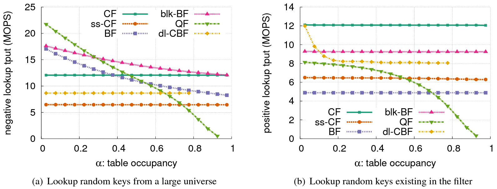 異なる占有率: この実験では、これらのフィルターが異なる占有率で満たされた場合の検索スループットを測定する。各フィルターの負荷計数 \(\alpha\) を 0 (空) から最大占有率まで変化させる。Figure 6 はすべてのクエリーがネガティブ (つまり存在しない要素) の場合とすべてのクエリーがポジティブ (つまり存在する要素) である場合の平均瞬間検索スループット (the average instantaneous lookup throughput) を示している。