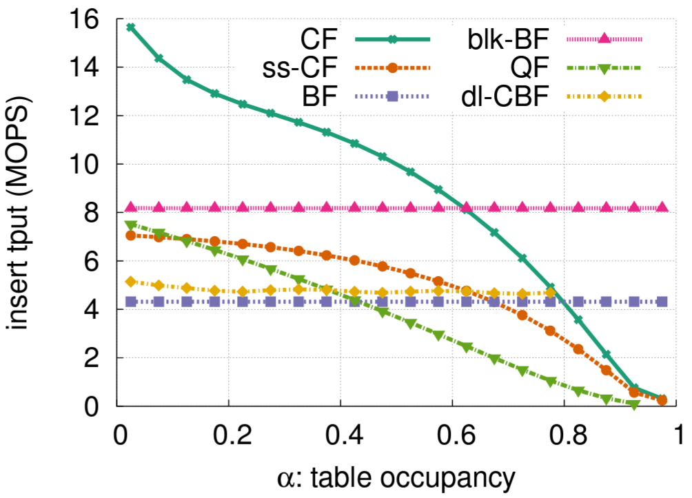 dl-CBF は一定のスループットを維持する。各挿入では最大 4 つのバケット内で空のエントリのみを検索する必要がある。そのようなエントリが見つからない場合、Cuckoo ハッシングのように既存の要素を再配置せずに挿入が停止する。最大負荷係数が 80% に満たないのもこのためである。