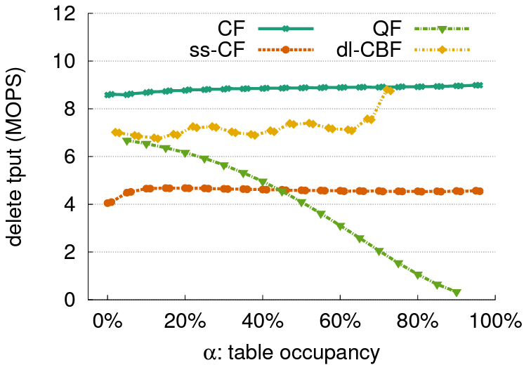 Figure 8 は削除をサポートするフィルター間の削除パフォーマンスを比較している。実験では、最初は満杯のフィルターから空になるまでキーを削除する。CF が最も高いスループットを達成した。CF と ss-CF はどちらもプロセス全体を通じて安定したパフォーマンスを提供する。dl-CBF はすべてのフィルターの中で 2 番目に性能が良い。QF は満杯に近い状態では最も遅いが、空に近い状態では ss-CF より速い。