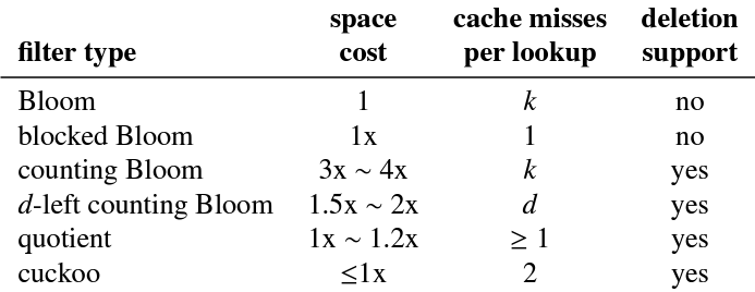Table 1 にまとめたように、標準の Bloom フィルターと削除のサポートや検索性能の向上を含む変種を比較する。これらのデータ構造はセクション 7 で経験的に評価される。Cuckoo フィルターはこれらのデータ構造より高い空間効率と性能を達成している。