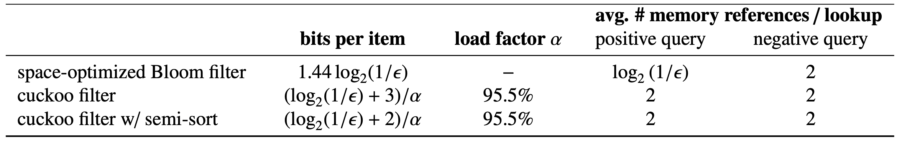 第二に、Cuckoo フィルターは各要素をハッシュテーブル内の複数の可能な場所に関連付ける。要素を格納する場所におけるこの柔軟性はテーブルの占有率を向上させるが、各検索でより多くの可能性のある場所を調査するときに同じ偽陽性率を維持するには、より長いフィンガープリントのためにより多くの空間を必要とする。セクション 5 では要素あたりの平均空間コストを最小化するためにテーブルの占有率とそのサイズのバランスを最適化する我々の分析を紹介する。
