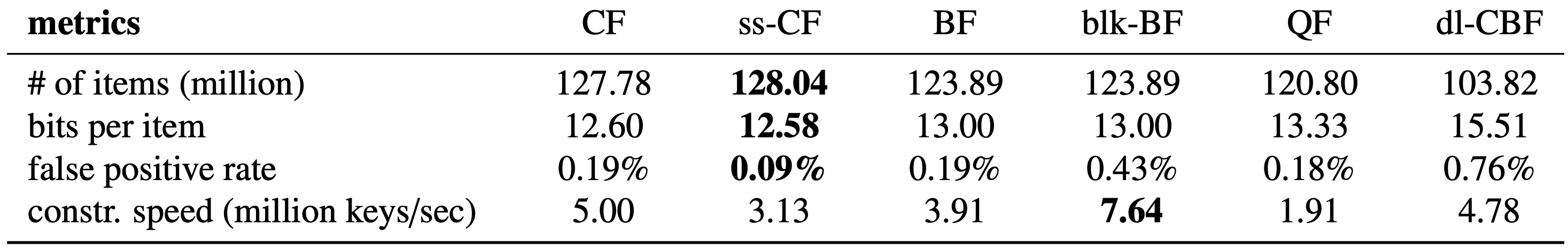 すべてのフィルターの中で ss-CF は最も低い偽陽性率を達成している。ほぼ同じ量の空間 (12.60 bit/item) を使用して半ソートを有効にすることで各要素のフィンガープリントに 1 ビット多くエンコードできるため、偽陽性率は 0.19% から 0.09% に半減する。一方、半ソートでは各バケットにアクセスする際にエンコードとでコードを必要とするため構築率が 1 秒あたり 500 万件から 313 万件に低下する。